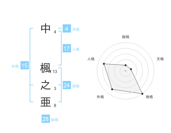 中 楓之亜さんの地格は24画の5点!