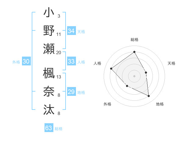 小野瀬 楓奈汰さんの総格は63画の4点!