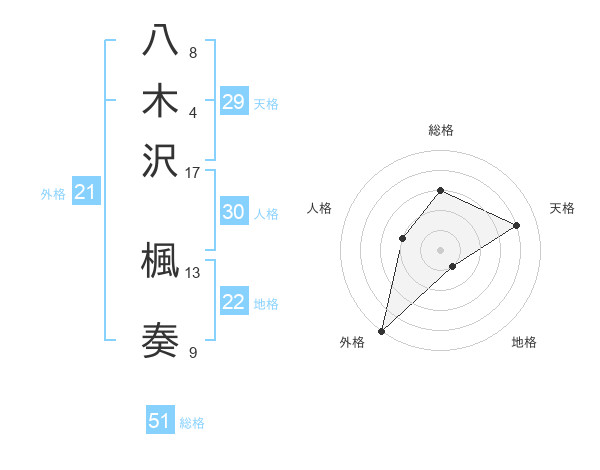 八木沢 楓奏さんの総格は51画の3点!