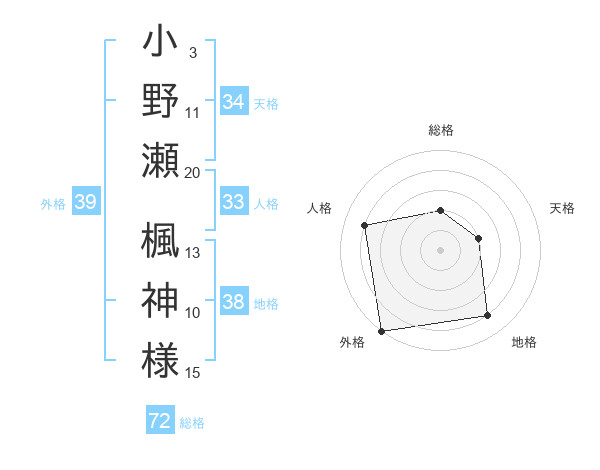 小野瀬 楓神様さんを姓名の画数から五運を鑑定
