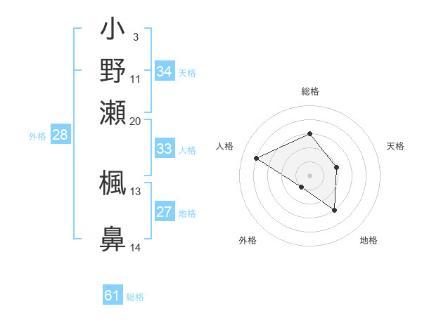 小野瀬 楓鼻さんを姓名の画数から五運を鑑定