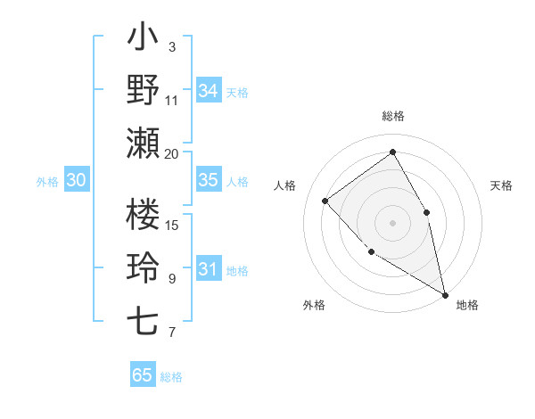 小野瀬 楼玲七さんを姓名の画数から五運を鑑定