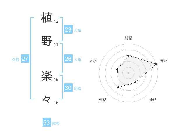 植野 楽々さんの総格は53画の3点