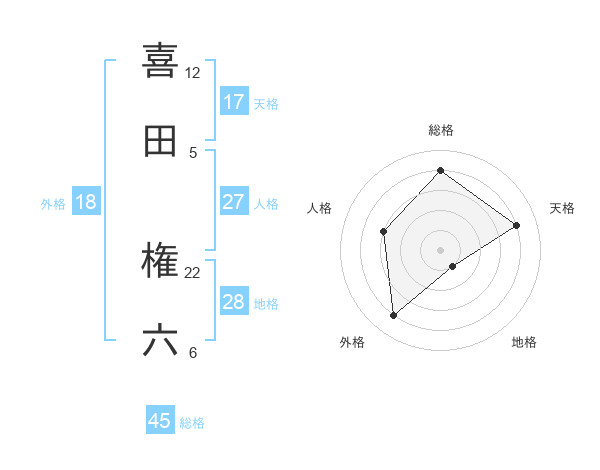 喜田 権六さんの総格は45画の4点!