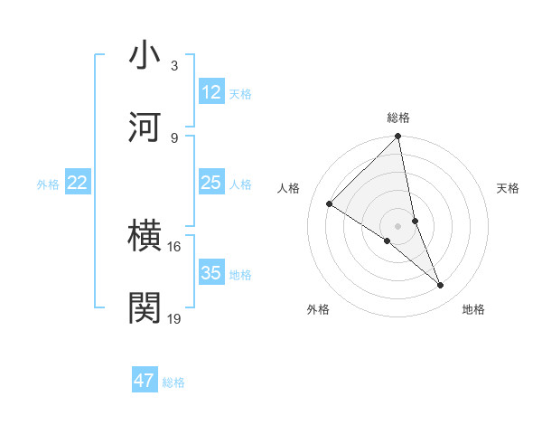 小河 横関さんの総格は47画の5点!