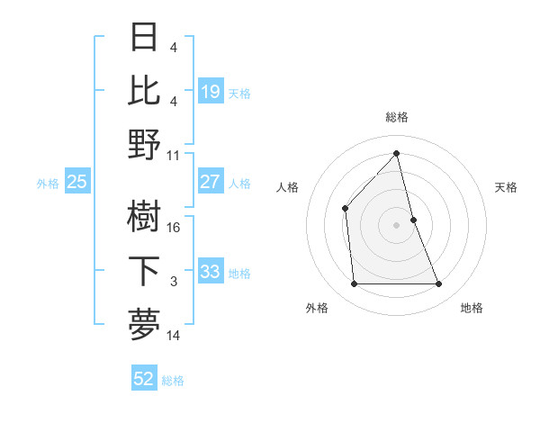 日比野 樹下夢さんを姓名の画数から五運を鑑定