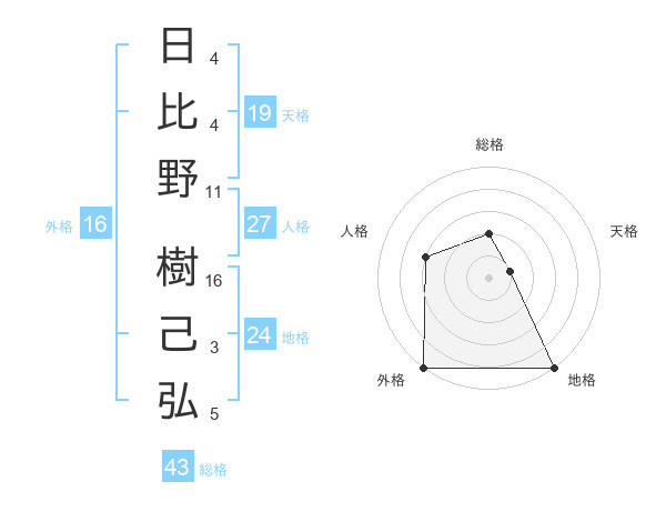 日比野 樹己弘さんの総格は43画の2点!