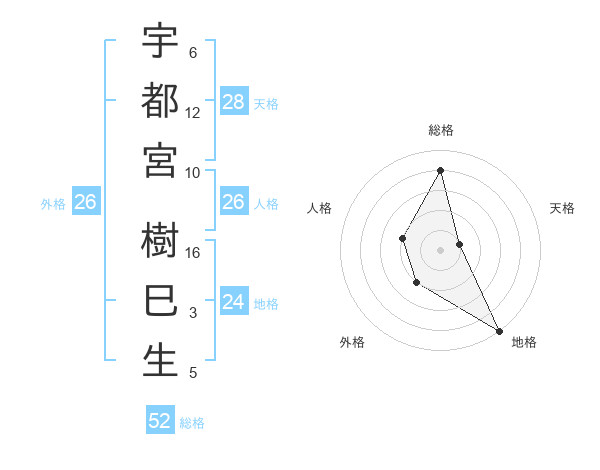 宇都宮 樹巳生さんの総格は52画の4点!
