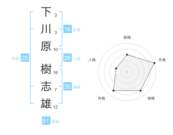 下川原 樹志雄さんの総格は51画の3点!