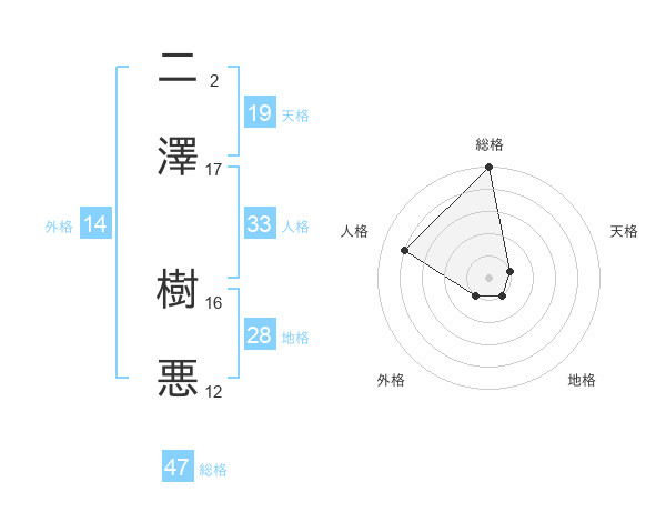 二澤 樹悪さんを姓名の画数から五運を鑑定