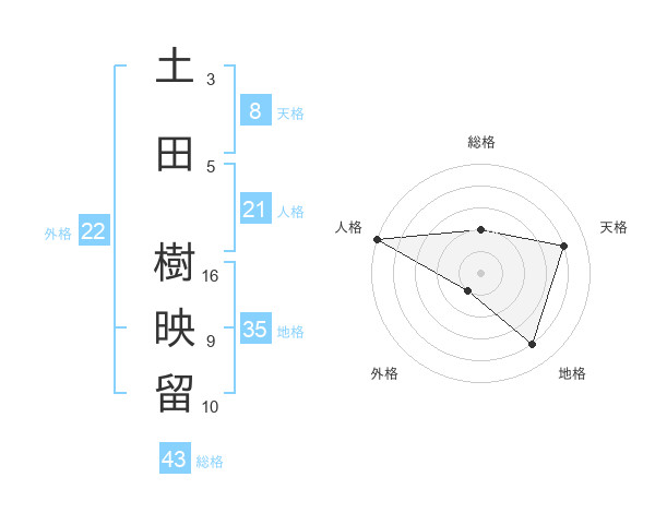 土田 樹映留さんの総格は43画の2点