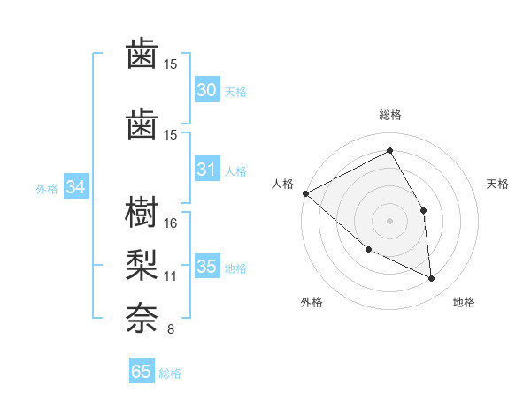 歯歯 樹梨奈さんの総格は65画の4点!