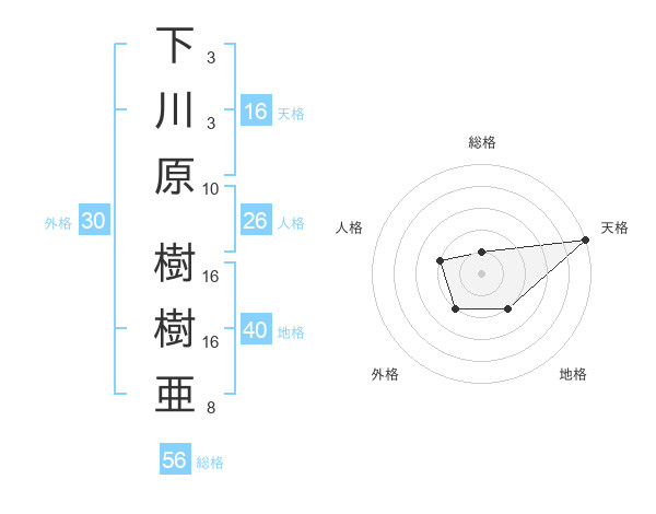 下川原 樹樹亜さんの天格は16画の5点!