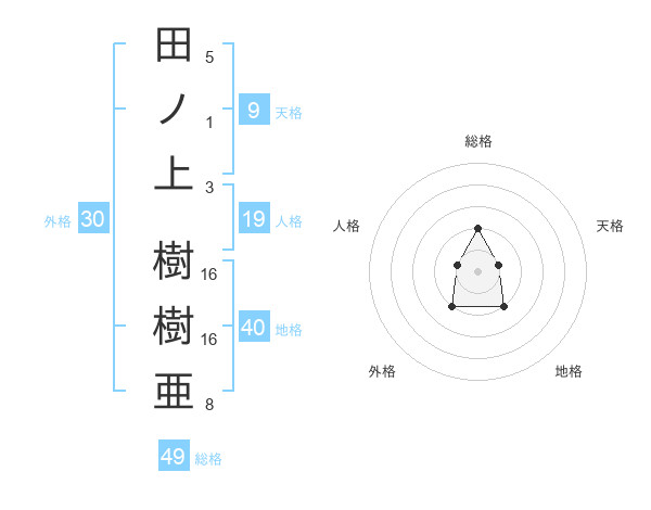 田ノ上 樹樹亜さんの総格は49画の2点!