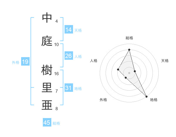 中庭 樹里亜さんの総格は45画の4点!