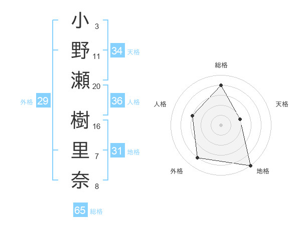 小野瀬 樹里奈さんを姓名の画数から五運を鑑定