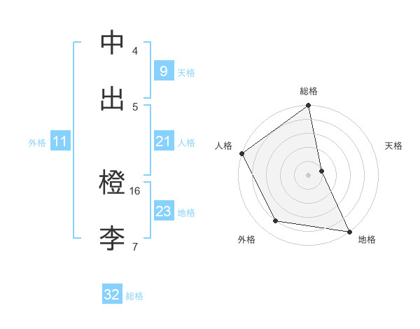中出 橙李さんの総格は32画の5点!