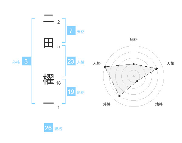 二田 櫂一さんの総格は26画の2点!