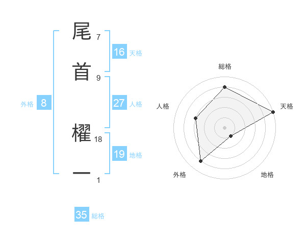 尾首 櫂一さんの天格は16画の5点!