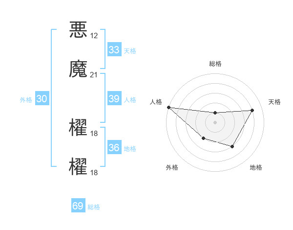 悪魔 櫂櫂さんの総格は69画の1点!