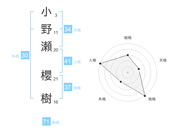 小野瀬 櫻樹さんの総格は71画の3点!