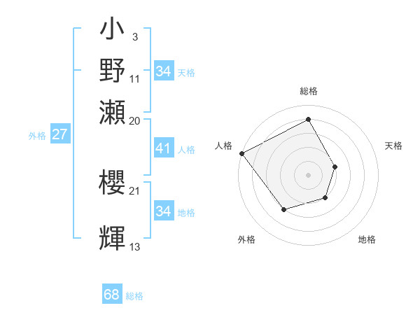 小野瀬 櫻輝さんの総格は68画の4点