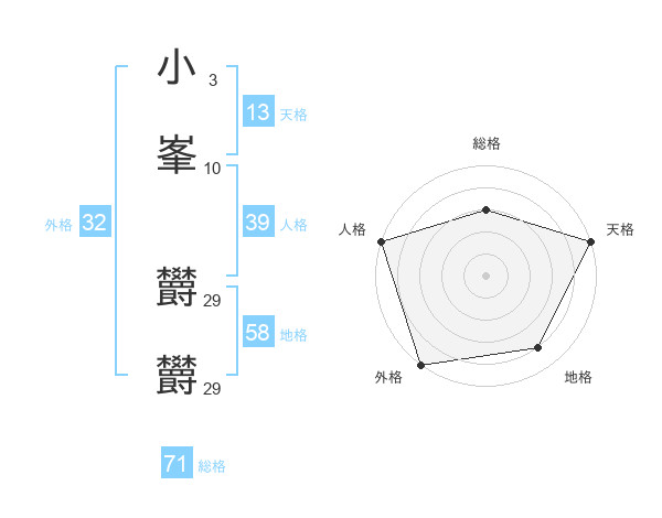 本サイトの鑑定結果の正当性は保証しません。鑑定結果は参考程度にお読みください。実際の名づけにご利用される場合は、姓名判断についてご自身でよくお調べください。