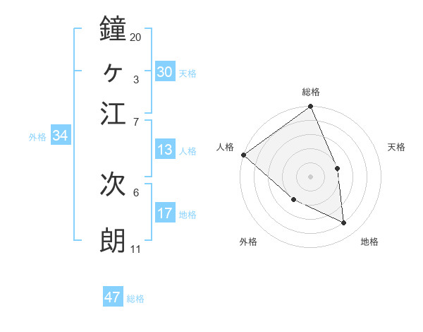 鐘ヶ江 次朗さんの総格は47画の5点