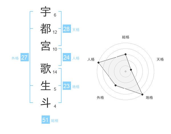 宇都宮 歌生斗さんの総格は51画の3点!