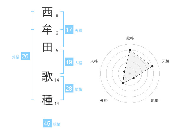 西牟田 歌種さんの総格は45画の4点!