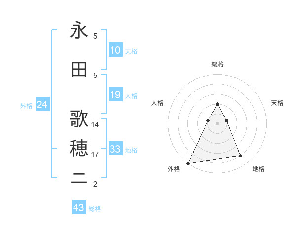 永田 歌穂ニさんの総格は43画の2点!