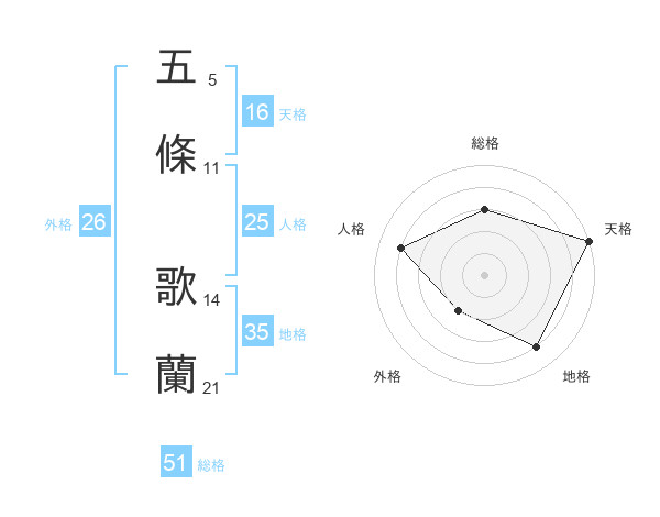 五條 歌蘭さんの総格は51画の3点!