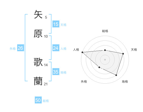 矢原 歌蘭さんの総格は50画の2点!