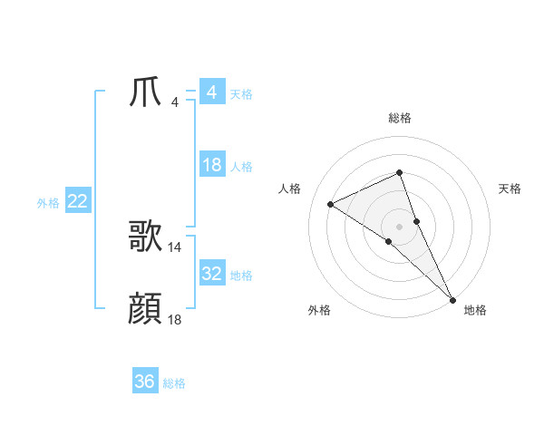 爪 歌顔さんの総格は36画の3点!