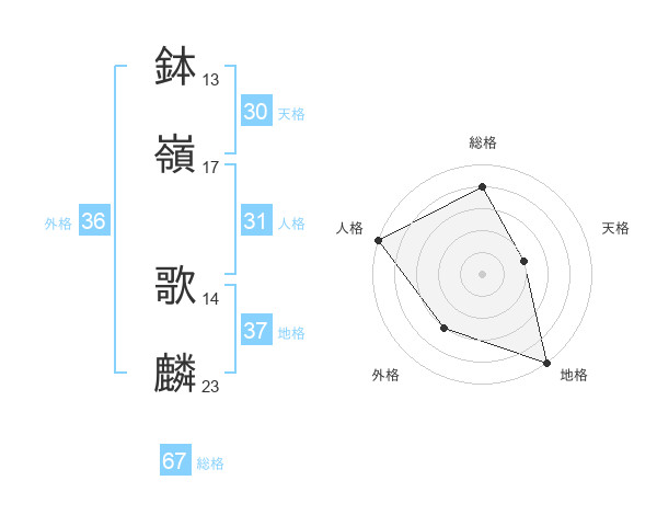 鉢嶺 歌麟さんの総格は67画の4点!