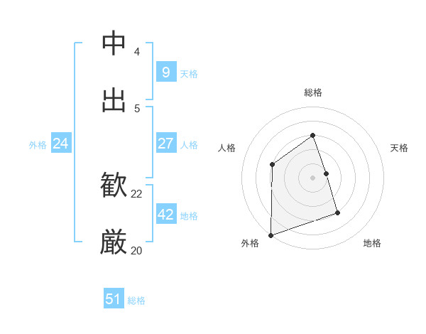 中出 歓厳さんの総格は51画の3点!