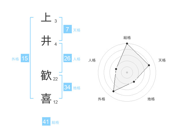 上井 歓喜さんの天格は7画の4点!