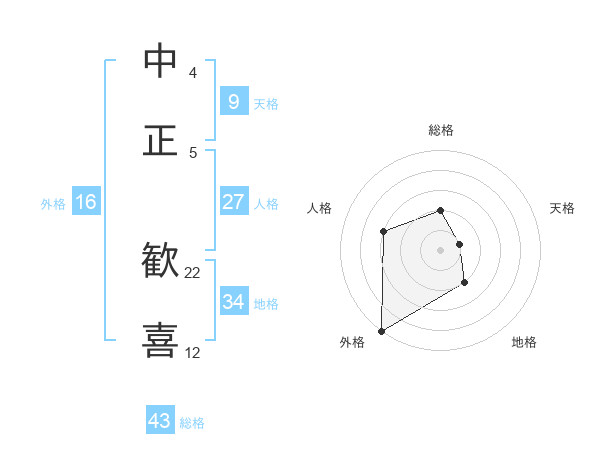 中正 歓喜さんの外格は16画の5点!