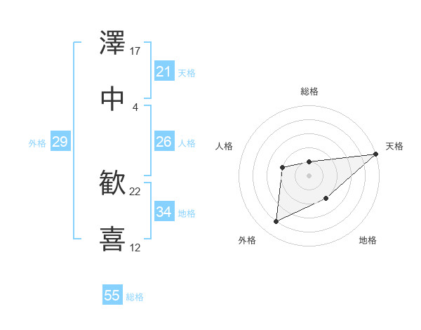 澤中 歓喜さんを姓名の画数から五運を鑑定