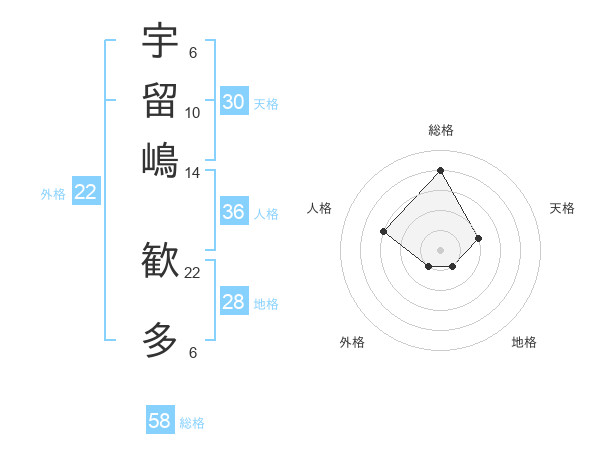 宇留嶋 歓多さんの総格は58画の4点!