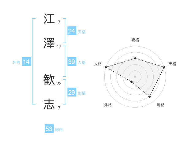 江澤 歓志さんの総格は53画の3点!