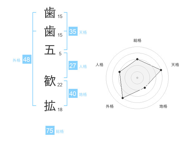 歯歯五 歓拡さんの総格は75画の3点!