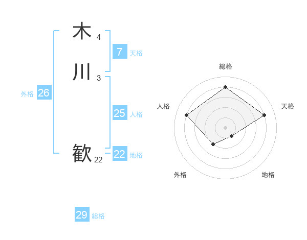 木川 歓さんの総格は29画の4点!