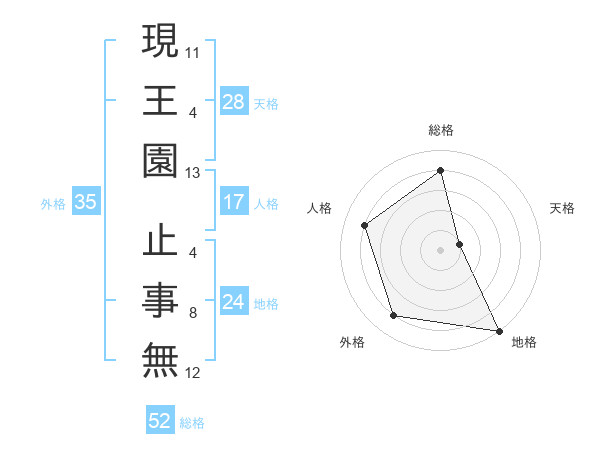 現王園 止事無さんの総格は52画の4点!