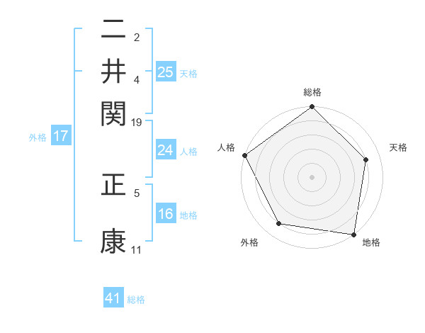 二井関 正康さんの総格は41画の5点!