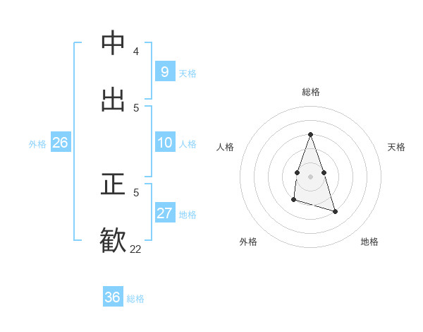 中出 正歓さんの総格は36画の3点!
