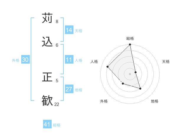 苅込 正歓さんの総格は41画の5点!