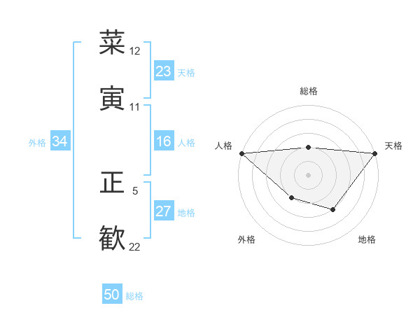 菜寅 正歓さんの総格は50画の2点!