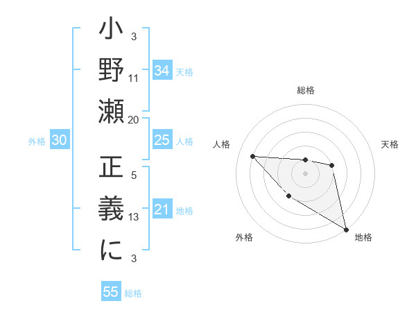 小野瀬 正義にさんの地格は21画の5点!
