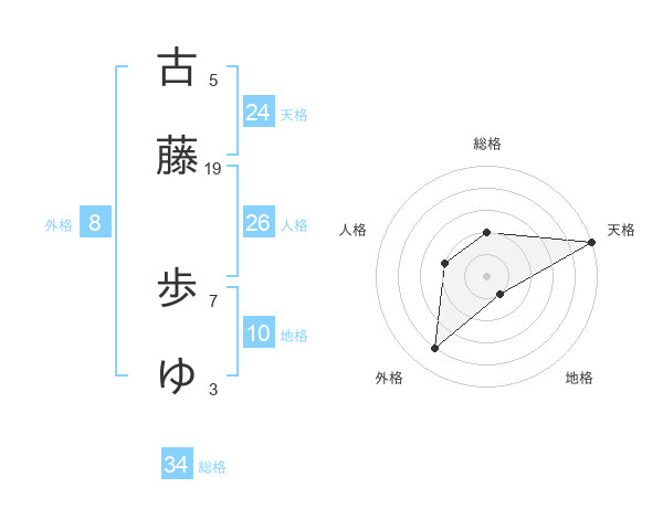 古藤 歩ゆさんの天格は24画の5点!